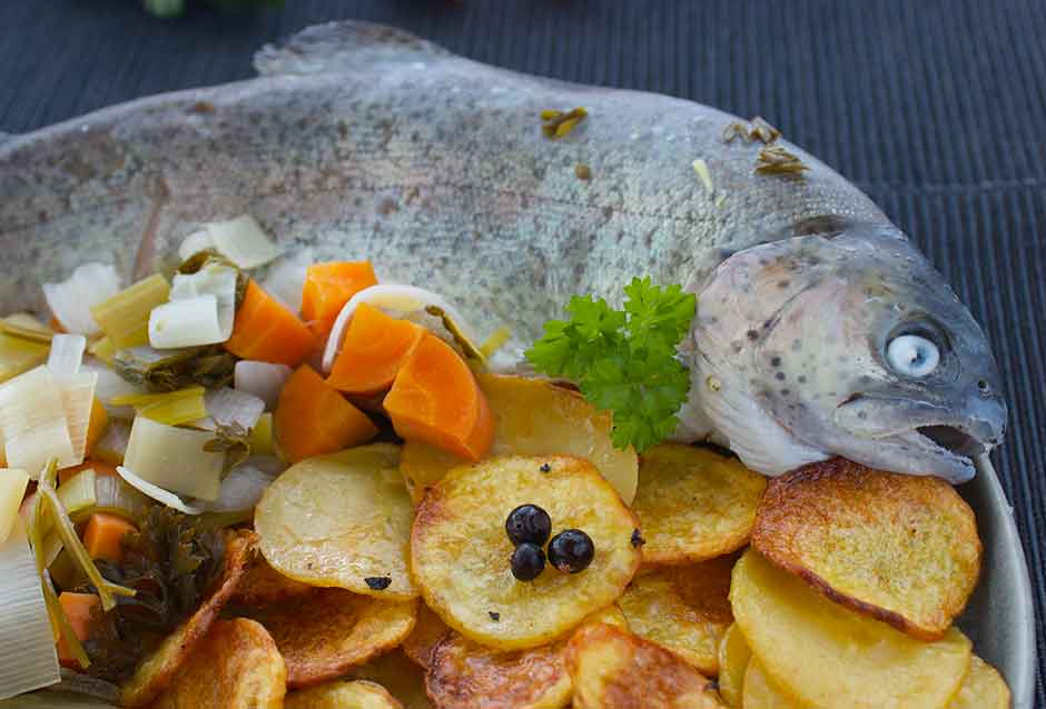 Dann geben wir die Forellen in die Brühe, die nicht mehr kochen darf, und lassen die Fische ca. 10 Minuten ziehen. Sobald die seitlichen Flossen ohne Mühe herausgezogen werden können, sind die Forellen zum Servieren bereit. Als Beilage eignet sich Gemüse und Kartoffeln.
